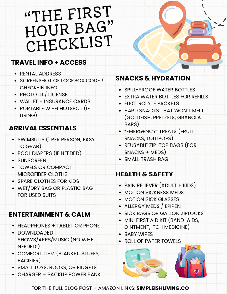 👇 Download the printable version of our First Hour Bag Checklist below. Keep it in your glove box or reuse it for every trip.